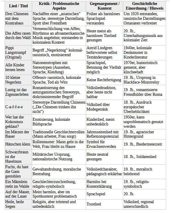 Im Folgenden habe ich einige bekannte Kinder- und Volkslieder zusammengestellt, die aus meiner Sicht kritisch betrachtet werden sollten. Diese Übersicht versteht sich nicht als „Verbotsliste“, sondern möchte Orientierung geben: Warum können bestimmte Lieder heute als problematisch empfunden werden – und wie lassen sie sich mit Wissen und Sensibilität besser einordnen oder gegebenenfalls ersetzen?