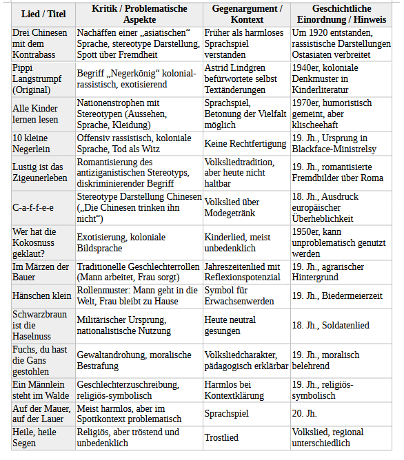 Im Folgenden habe ich einige bekannte Kinder- und Volkslieder zusammengestellt, die aus meiner Sicht kritisch betrachtet werden sollten. Diese Übersicht versteht sich nicht als „Verbotsliste“, sondern möchte Orientierung geben: Warum können bestimmte Lieder heute als problematisch empfunden werden – und wie lassen sie sich mit Wissen und Sensibilität besser einordnen oder gegebenenfalls ersetzen?